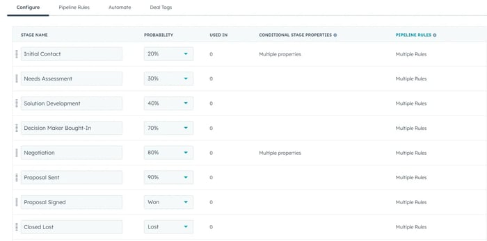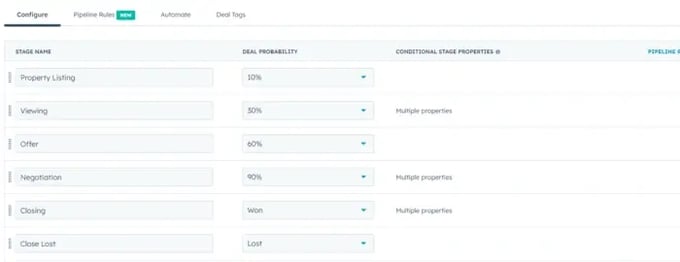 Property Listing: The pipeline might include details like property type, location, price, and target buyer profile. HubSpot allows you to create custom deal properties to capture all relevant information about each listing.