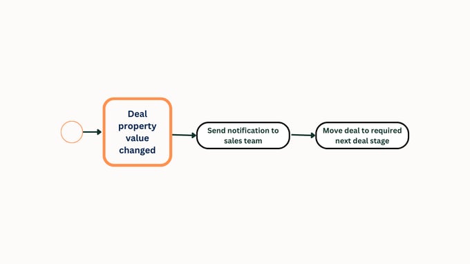 Example: Triggered when a salesperson changes status on a deal: Notify appropriate team members, update the pipeline automatically & advance to the next stage.